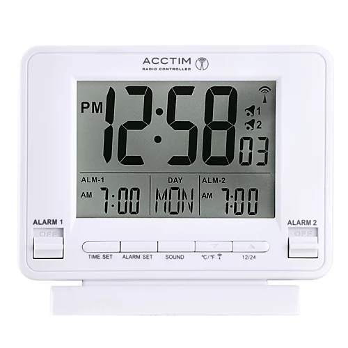 Delaware is radio controlled alarm clock that makes an easy time of things, thanks to its automatic setup function. The calendar, day and indoor temperature function will keep you informed with aplomb, thanks to its easy-to-read display. Delaware also features a dual crescendo alarm with snooze and green back-light.