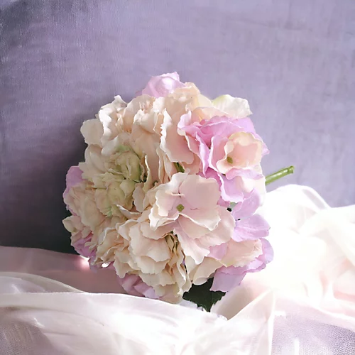 - A textured, all-over blush pink short stem hydrangea