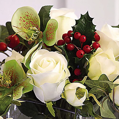 - Fezziwig; Named after the benevolent character “Dickens” , in “A Christmas Carol”, this is the perfect table decoration for all your festive plans, designed with pure white roses in bud (and in full bloom), mixed with hellebores and a mix of winter foliage and red berries.