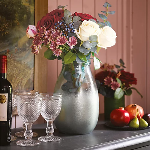 - Flowers; This bouquet is bursting with joy, featuring velvety red and cream roses, ivy leaves and berries, pink astrantia and soft green foliage, all hand tied together and ready to drop into your favourite vase.