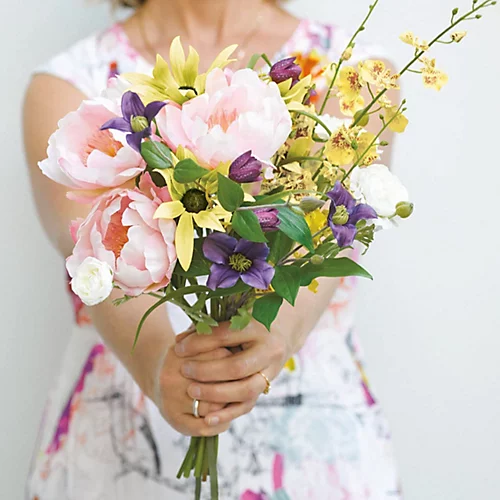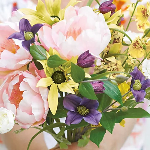 - Wild Sophisticated Bouquet: The bouquet is a complex and totally unexpected hand-tied selection of faux blooms that harnesses clashing colours and contrasting shapes for a magical mismatch of fabulous flower stems. Clematis, orchids, zinnias, fritillaries, peonies, white ranunculi and black-eyed susans, all ready to drop into a favourite vase and display in kitchen or sitting room.