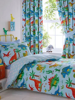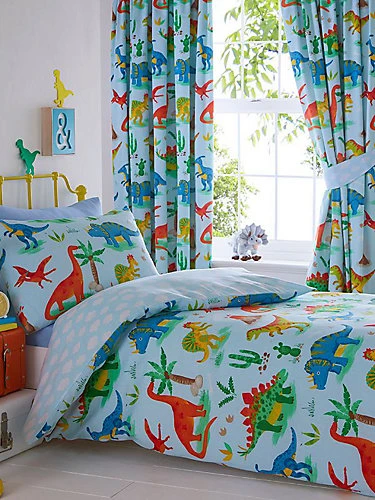 This fun Dinosaur World junior duvet cover set will add the perfect finishing touch to a dinosaur themed bedroom. The design features a collection of colourful dinosaurs on a light blue prehistoric themed backdrop patterned with trees, foliage, volcanoes and footprints. The reverse has a coordinating repeated cloud pattern on a light blue background. This bedding set is made from a polycotton blend and can be machine washed and tumble dried on a cool setting.