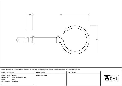 Our extensive collection of curtain furniture allows you to fully furnish your home with matching From The Anvil products, down to the finest details.These finials add a decorative finishing touch to our range of curtain poles.Our finials can also replace the standard ends provided with our large pull handles, allowing coordination throughout your home.Supplied as a pair.Our Black finish is a popular choice in traditional settings. Its subtle sheen offers a bold contrast on stained and painted timber alike. During the manufacturing process, our Black products are baked in a high-temperature oven, giving them durable, corrosion-resistant qualities.Overall Width: 102mm