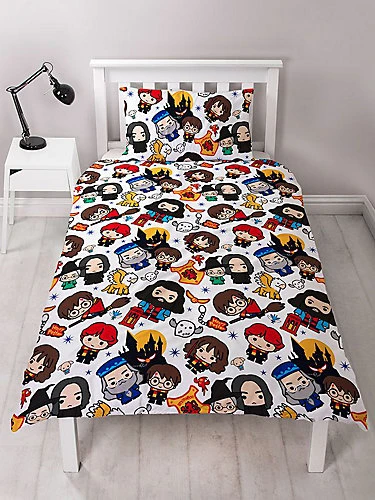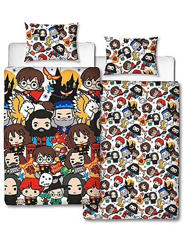 This Harry Potter Charm single duvet cover set is a must for any Potter fan! The colourful design features fantastic cartoon style versions of your favourite characters such as Harry himself, Ron, Hermione, Hagrid and Dumbledore across the whole duvet cover, while the reverse has smaller versions of the characters in a repeat pattern on a white background. This bedding set can be machine washed and tumble dried on a cool setting.