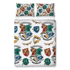 100% Polyester Microfibre. Contents: Duvet Cover, Pillowcase. Design: Crest, Grid, Hogwarts Houses, Reversible. 100% Officially Licensed. Fabric Technology: Durable, Quick Dry, Soft.