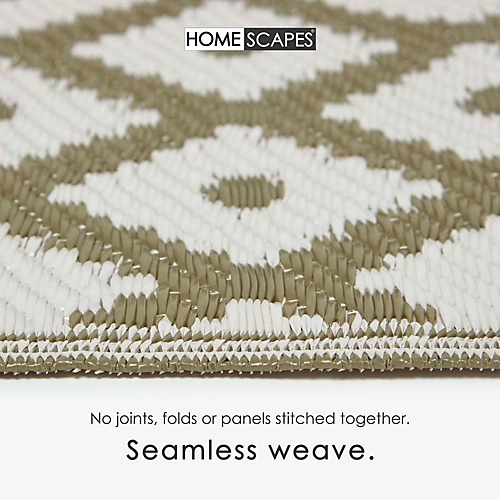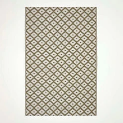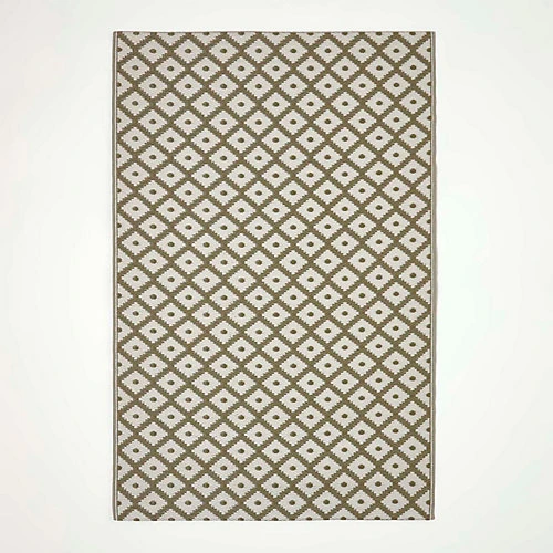 - Homescapes geometric style ‘May’ white and olive green woven outdoor rug for garden and patio area. Material: 100% Recycled Plastic. Size: 180 x 270 cm. Colour: green and white.