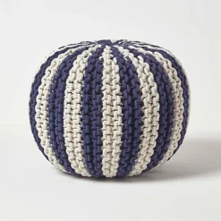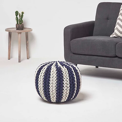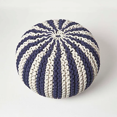 - 100% cotton knitted pouffe striped footstool. Colour: navy and off white. Measures: 35 x 40 cm