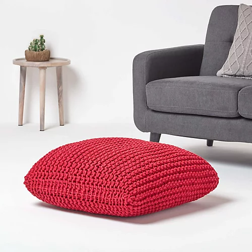 Homescapes has by far the largest range of knitted pouffes and cubes in the UK and possibly in Europe. A selection of 5 contemporary colours and two different shapes allows you a vast choice not available anywhere. These knit pouffes and knitted large floor cushions have been hand made from 100% sturdy cotton and filled with robust polystyrene beads. The filling ensures that the poufs do not lose their shape while sitting on them. They are very colourful, fashionable and true all-rounders. They can, for example, be used as make shift stools and occasional seats for visitors, decorative floor cushions or comfortable footstools. They would look equally at home in a Nordic setting along with the rest of your warm soft furnishings, or in a sleek modern setting providing a splash of colour.