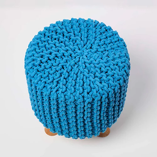 Homescapes Teal Blue Tall Cotton Knitted Footstool On Legs
