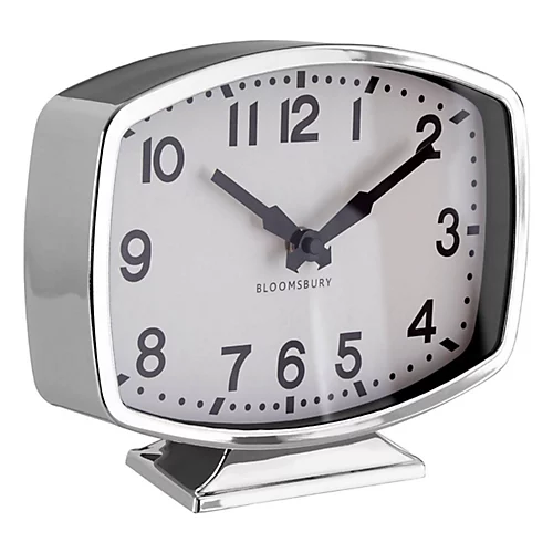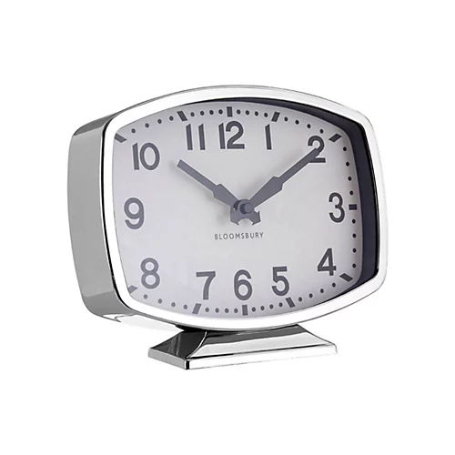 Its reflective chrome finish lends the Bailie table clock well to contemporary monochromatic style interiors. Featuring bold, black numerals the clock has a wide face with curved edges, adding a hint of retro appeal to the design. Two sleek black hands with a subtle geometric shape add a decorative touch to this accent piece.
