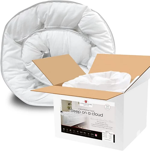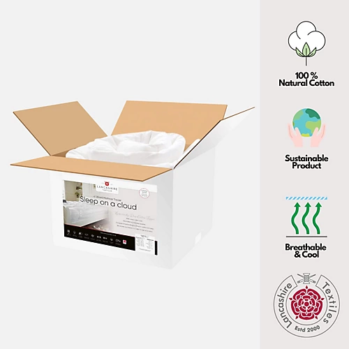 The Lancashire Textiles Sleep on a Cloud mattress topper is 10cm of unparalleled luxury for any bed, no matter its age or condition. Expertly crafted in Britain with over 20 years of experience in textiles, this topper is pure indulgence everyone can enjoy. A 100% cotton 233 thread count casing is beautifully soft and kind to the skin while remaining breathable for year-round use, and bounceback hollowfibre creates a supportive snuggly mattress. We box stitch this topper to ensure the filling remains evenly distributed throughout the night and comes with elasticated straps to fit almost any mattress. This topper gives you that luxury hotel feeling every night in your own home, as they are shipped around the world for use in 5-star high-end hotels, including establishments located in the Emirates.