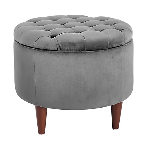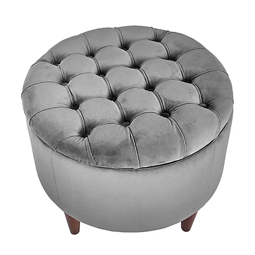 A gorgeous pouffe, made from sumptuous grey velvet, alongside a quilted sunken button design, a removable lid for extra storage space and supported by four sturdy legs. A great addition to your living room and can be used as a foot rest or occasional seat.