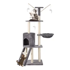 - PROTECT YOUR FURNITURE: Not only will your cat tower give your cat hours of fun, the sisal scratching post will also keep your sneaky feline friend away from your sofa (AKA makeshift scratching post) and out of mischief!