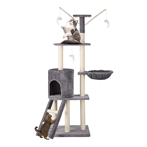 - ALL IN ONE: Your cat climbing frame comes complete with a soft hammock bed for snoozing, hanging toys for playing and 3 platforms with stairs for exploring, all sure to keep your cat entertained.