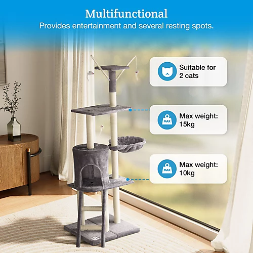 - STURDY & STABLE: Measuring H146 x W75 x D46cm, the wide base and height of your tall cat tree for indoor cats means that you can trust it to support your furry friend, large or small.