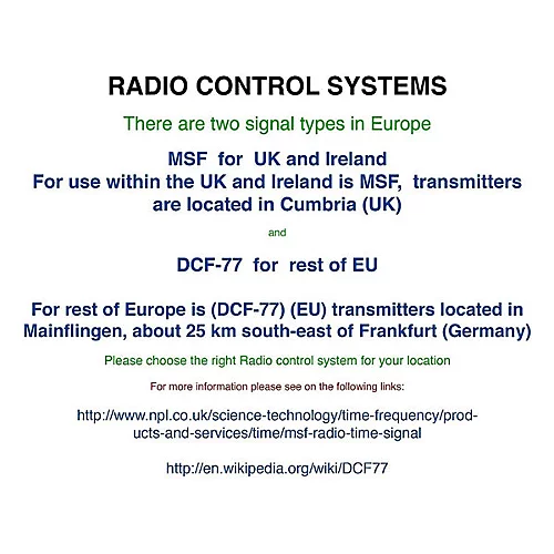 Automatic time change for Spring & Autumn and automatic time checks, accurate to 1 second in 10 million years, have automatic set up for time and calendar (where applicable), The National Physical Laboratory (NPL) which is the UK’s home of measurement and the nation’s timekeeping. NPL is responsible for operating the national time system and making accurate time available across the UK. This clock keep accurate time by picking up the NPL’s radio signal, called MSF, which is transmitted on 60KHz from Cumbria. This transmission carries a date and time code that the radio controlled products use to set themselves to the correct time. The signal is controlled by atomic clocks at the radio station and are adjusted to keep in step with the national time maintained at NPL laboratory in London.