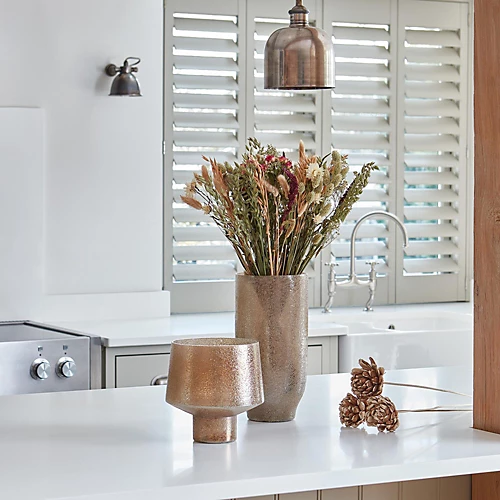 Catching the eye with its premium glaze and metallic gold hue, the Opulent collection brings luxurious style wherever it goes. Curved in structure for an elegant aesthetic, each piece is fully waterproof and lovingly handcrafted from recycled glass for both style and sustainability. Place a fresh bouquet or dried blooms inside and feel enriched by the beauty for days on end.