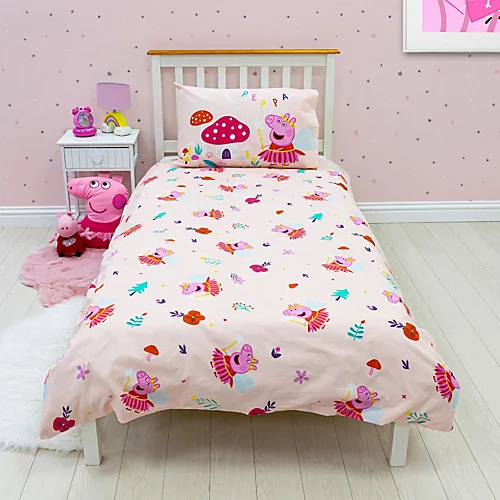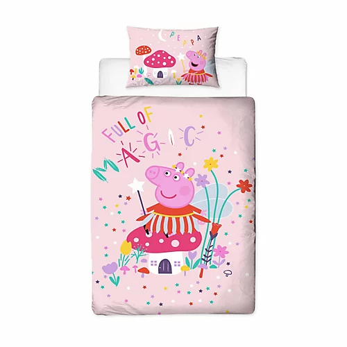Get your little one ready for bedtime with this adorable Peppa Pig single duvet! This duvet set features a fun print of Peppa being full of magic. Reversible two with a fun and magical design on the reverse. They will be dreaming of magical adventures with Peppa in this oink-tastic single duvet set. The bedding set comes complete with matching pillow case(s). This duvet is made from a polycotton blend allowing for ultimate comfort and durability. This duvet cover will ensure the best night’s sleep for your little ones.