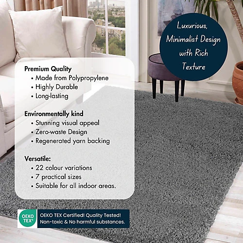 The Oxford Shaggy Rug is a perfect for adding character, texture and warmth to your home. The updated design from the classic shaggy comes in a variety of bright colours to suit any room in your home. Designed to be soft under the foot with a woolly touch, the Oxford Shaggy Rug is made with 100% twisted heat-set polypropylene with a deep pile of 5cm will keep your home cosy and stylish. The rug has been treated with colourfast technology, which provides this rug with increased colour retention even after prolonged exposure to the sunlight. This non-shed rug is easy to clean with a shake and vacuum, additionally the stain resistant properties will make your rug a long-lasting statement piece in your living room or bedroom. With its solid constructions, the Oxford Shaggy Rug maintain its robust finish, even after years of extensive use.