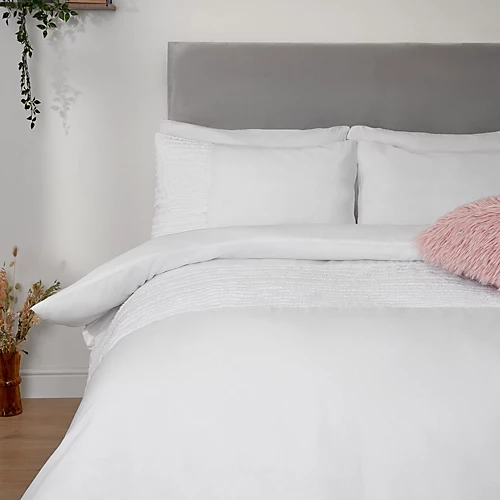This luxury tufted stripe panel duvet cover set from the Sienna range will be sure to modernise your room. The face features a soft tufted striped panel design and the reverse side is a soft polyester, the set comes with matching pillow case(s) to complete the look. This modern duvet cover is made from 100% polyester which is soft, comfortable and durable, allowing for a relaxing nights sleep. Panel: Duvet – 40cm, Pillowcases: 20cm. Available in the following sizes:- Single: 135cm x 200cm (53″ x 78″) – 1 x duvet cover & 1 pillowcase (50 x 75cm) Double: 200cm x 200cm (78″ x 78″) – 1 x duvet cover & 2 pillowcases (50 x 75cm) King: 230cm x 220cm (91″ x 87″) – 1 x duvet cover & 2 pillowcases (50 x 75cm) Super King: 260cm x 220cm (102″ x 87″) – 1 x duvet cover & 2 pillowcases (50 x 75cm) Colour: Available in: Blush Pink, Silver Grey, or White with matching tufted stripe. Please note that this is not a comforter. Material: 100% Polyester Microfiber Includes: Quilt cover with pillowcase(s) Washing Instructions: Machine washable at 40°C Brand: Sienna