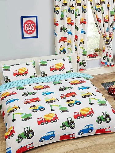 The Trucks and Transport Double Duvet Cover and Pillowcase Set offers a fun and colourful finishing touch to your little ones bedroom. The design features a collection of brightly coloured trucks, diggers and other vehicles on a white background, with a blue star pattern on a light blue background on the reverse. Made from Easycare material, the polycotton bedding set is suitable for machine washing and tumble drying on a low setting. Matching curtains and a coordinating fitted sheet are also available to complete the look.
